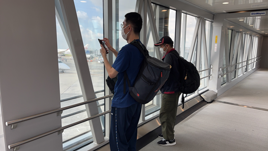 松山空港から伊丹空港へ飛行機で向かいました。そして、伊丹空港から万博の近くまでタクシーで行き、最後は地下鉄に乗って万博の会場に到着しました。
